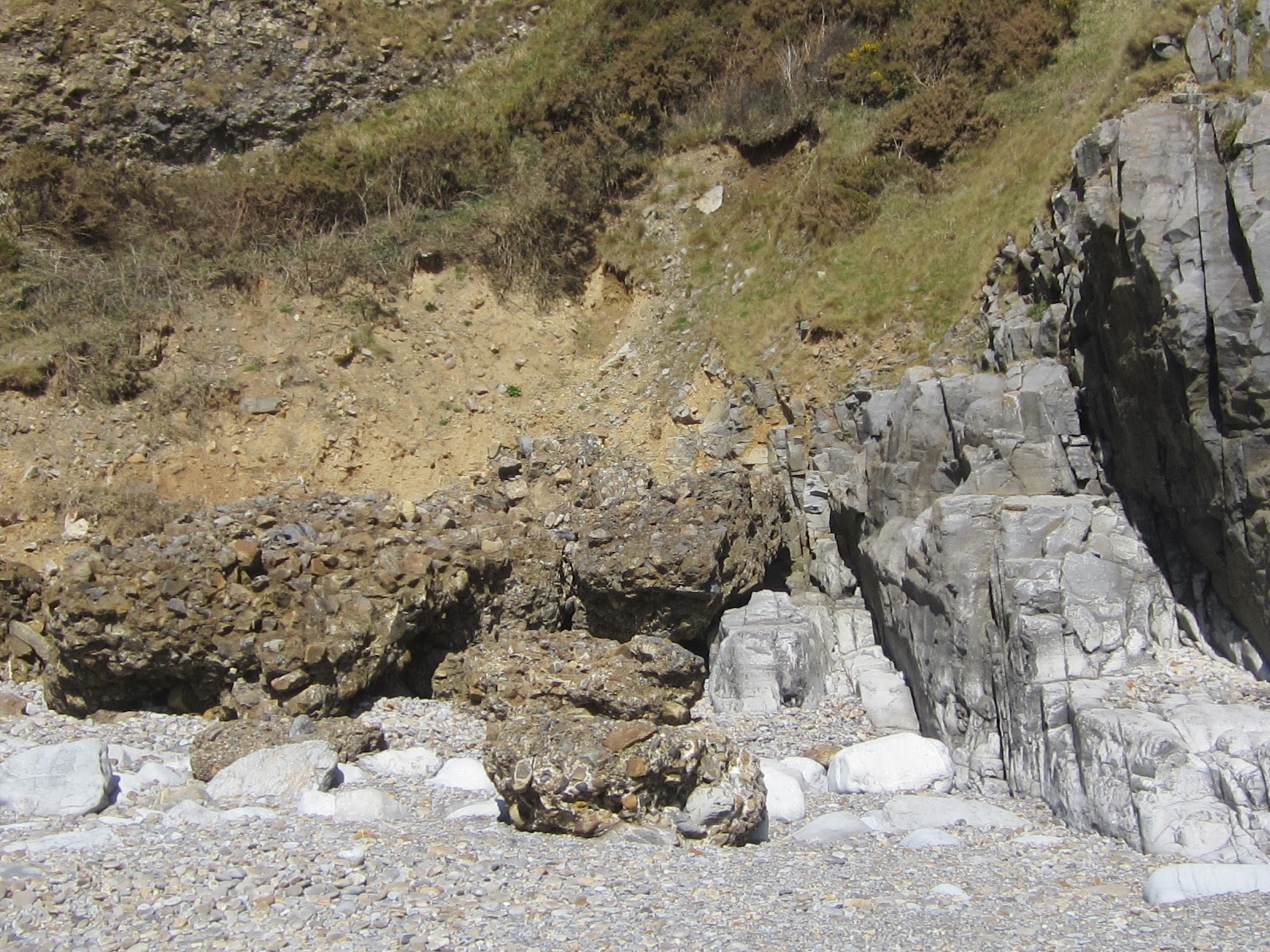 This has to be one of the strangest coastal landscapes I have seen anywhere in Wales. At the east end of the Morfa Bychan storm beach, where the cliffline extends out to Gilman Point, there are huge blocks of cemented slope breccia (made of shattered blocks and shards of sandstone and shale) resting on the storm beach. It's difficult to get a sense of scale when you look at them from a distance, but up close they are rather impressive -- up the the size of caravans. I estimate that some of them weigh upwards of 200 tonnes. This is a carbonate-rich environment, with Carboniferous Limestone outcropping at beach level -- so that's where most of the cement has come from. But there also seems to be iron oxide and manganese oxide cement in places. There are some cemented breccia layers outcropping at the base of the breccia cliff face around HWM, but others can be seen more than 10m above HWM in the vast scar that has been cut into the valley slope. The slope breccias are chaotic, formed more through occasional cliff falls and slope collapses than through the slow accumulation of layer after layer. It's difficult to work out any history of sedimentation here, apart from saying that these slope materials have accumulated over many thousands of years. There is no way that this cliff exposure can be tied in to any glacial sequence.